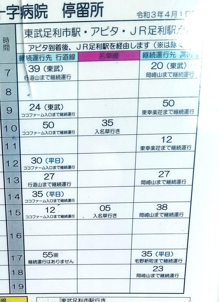 (下図は現地「足利赤十字病院」停留所の東武足利市駅方面へのバス時刻表です。令和3年4月1日改正ダイヤに基づいています)