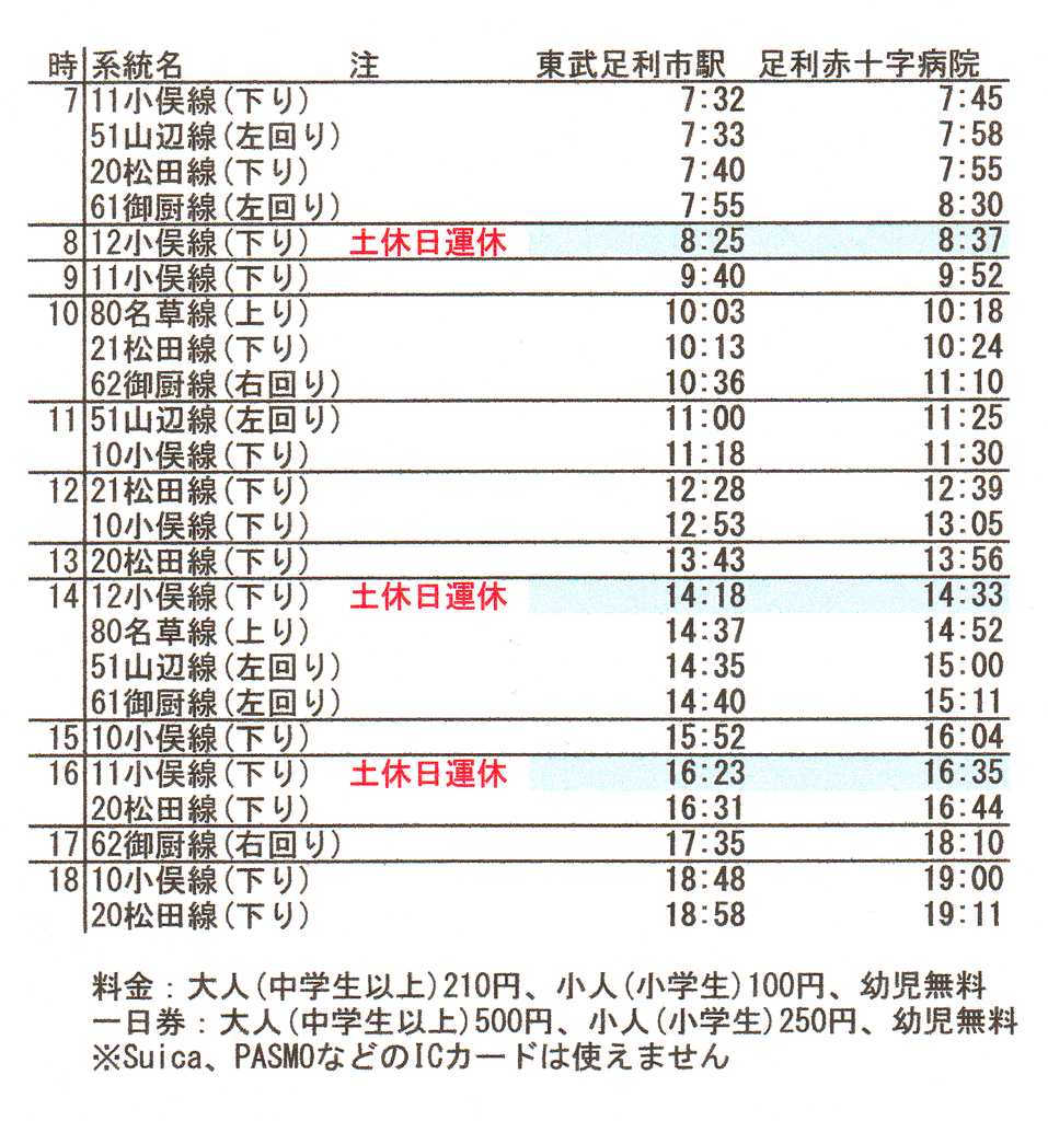 (下表は運営人が個人的に作成した、東武足利市駅→足利赤十字病院のバス時刻表です。令和3年4月1日改正ダイヤに基づいています。記載漏れその他の誤りがあったらゴメンナサイ。) このバス停は5路線のルートが集中する市内交通の要衝で、日中ほぼ1時間に1本程度以上運行されています。