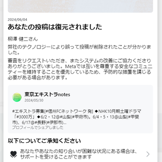 で、そこまでやって待つことしばし......なんと、ものの数分で「あなたの投稿は復元されました」なるメッセージが送られてきた。