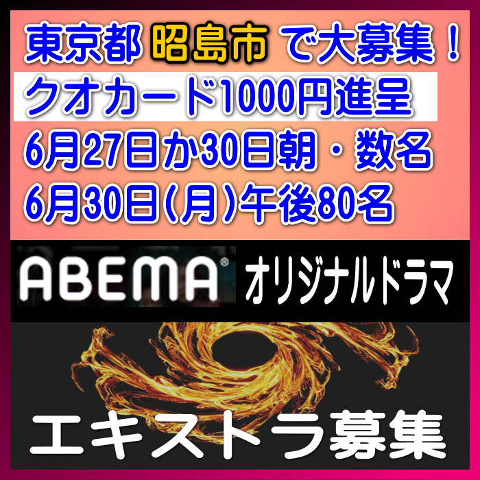 別にご案内しているABEMAオリジナルドラマ 各地版と同じドラマですが、こちらでは東京都昭島市での募集情報に絞ってお伝えしています。※昭島市は中央線「立川」のちょっと先のエリア(青梅線沿線)になります。