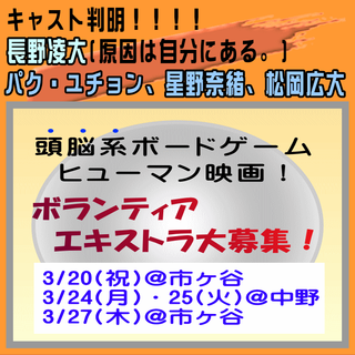 ・役柄 :大規模なボードゲーム大会の観客、スタッフ、撮影クルー、競技者(役柄は当日割り振らせていただきます)