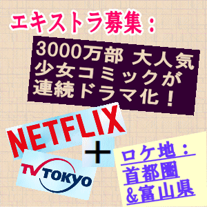 - 無償ボランティアエキストラの募集となりますので、撮影参加に伴う撮影現場までの交通費・宿泊費・出演料のお支払いはできません。ご了承ください。
