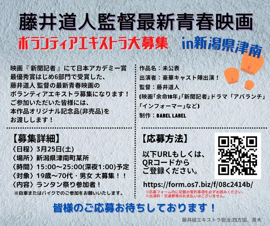撮影予定地が「東京都内」「神奈川県(鎌倉市)」「長野県(松本市)」「新潟県(津南町)」と各地にまたがります。本作エキストラ参加にご興味がわいた各撮影予定地近隣・近県の皆様、とりあえずボランティア・エキストラ登録したうえで、後日担当者さんから送られてくる具体的募集日程等の情報をお待ちください。
