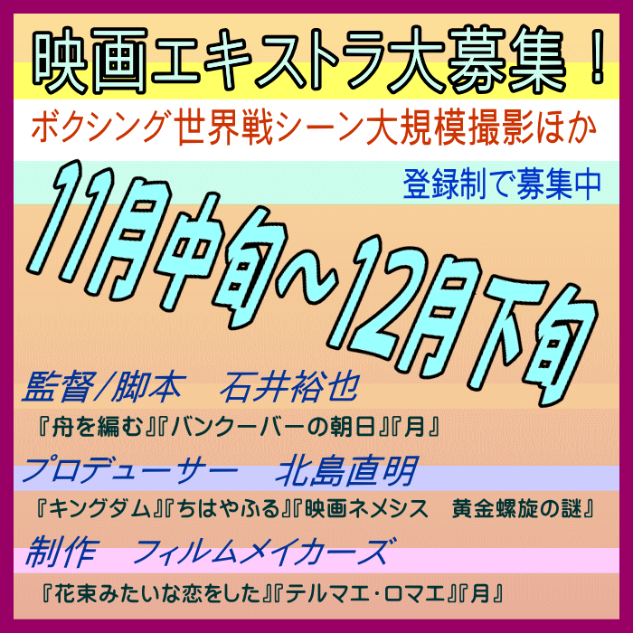 事前登録形式となっており、実際の撮影は11月中旬からとのことです。本作に出演してみたい方は、ひとまずリンク先で「事前登録」をお済ませになって、スタッフから具体的な募集スケジュールが通知されるのをお待ちください。