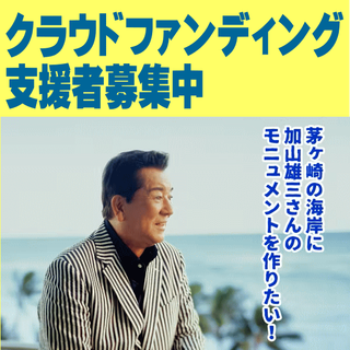 今回我々は、未来にわたって加山さんのご功績をしっかりと伝え続けてゆくこと、そして、このまち茅ヶ崎から常に新しい文化を発信し続けるその原動力となることを目指し、加山雄三さんのモニュメントをご本人が遊び作曲した海岸に設置するためのクラウドファンディングを企画しました。