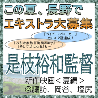 (春編の募集記録<終了済み>)エキストラ募集◆是枝裕和監督、待望の新作映画!〓◆3~5月中旬@長野県諏訪郡&周辺<事前登録制>〓◆『そして父になる』『海街diary』『三度目の殺人』『万引き家族』の監督が取り組む新作!