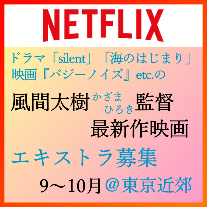 制作会社のご依頼により、Netflix独占配映画のエキストラ募集情報をお知らせします。
