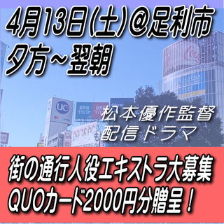 この度、4月13日(土)夕方~翌朝に栃木県足利市にて行われる撮影にご協力いただけるエキストラの皆様を大募集します!!