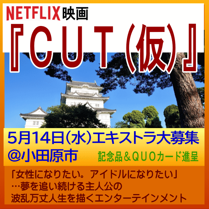 作品は、3月下旬宇都宮ロケの募集をご案内した NETFLIX配信映画『CUT(仮)』。今回は神奈川県小田原市で、じつに900名のエキストラさん大集合が目標!という大プロジェクトとなっています。