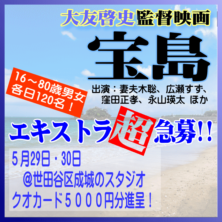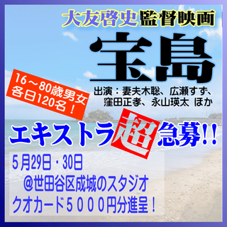 4月下旬まで沖縄県でのエキストラ募集情報を記事としてお伝えしていた作品ですが、今月初旬に続き、さらに東京都内の某撮影スタジオでの大募集の情報が舞い込みました。