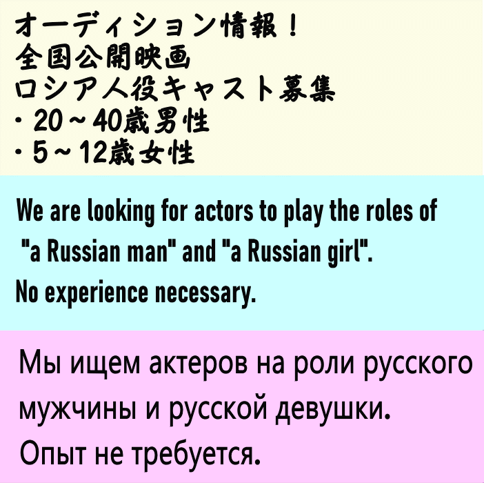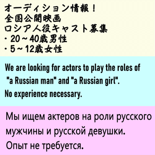 劇中に登場する「ロシア人の男性」、「ロシア人の少女」を、演技経験のない一般の方も含めて、幅広くオーディションを行うことになりました!