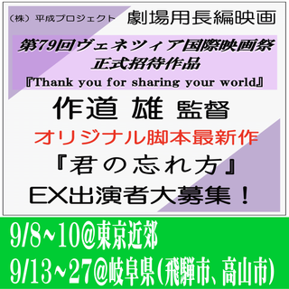 エキストラ募集[飛騨市 発]◆作道(さくどう)雄オリジナル脚本・監督映画『君の忘れ方』岐阜パート9/13~27@岐阜(高山市、飛騨市)