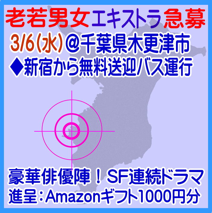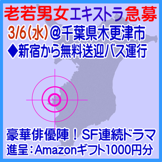 お車で木更津市某所に朝7時に集まれる方、もしくは朝6時に新宿に集まれる皆さん。規格外の国際派SFドラマの世界を体験してみませんか!?