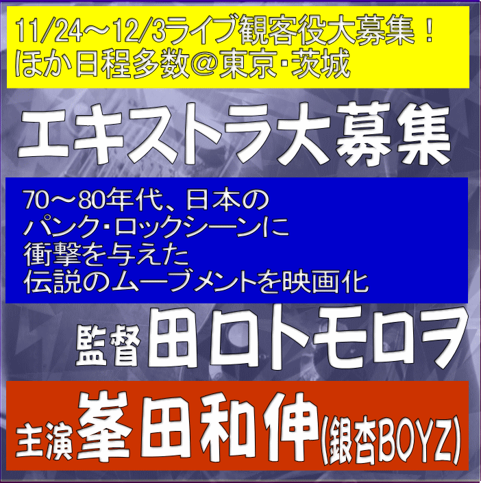 11月24日(日)~12月3日(火)にかけて断続的に実施される茨城県行方市ロケ(この映画のクライマックスである音楽ライブのシーン。東京から送迎バス運行あり)は、特に熱烈募集中です。ライブ好きな若手の皆さん、どうぞよろしく。