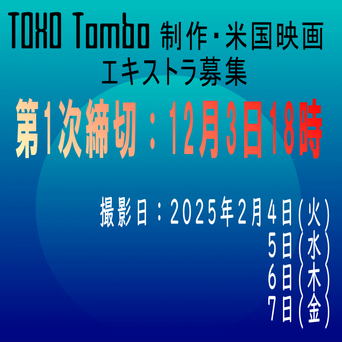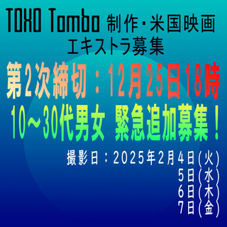 - 個人情報に関しましては、TOHO Tombo ピクチャーズ株式会社から依頼を受けた合同会社アネットワークで厳重に管理し、撮影の参加確認、緊急時のご連絡などの撮影に関する連絡のみに使用し、それ以外には使用しないことをお約束いたします。