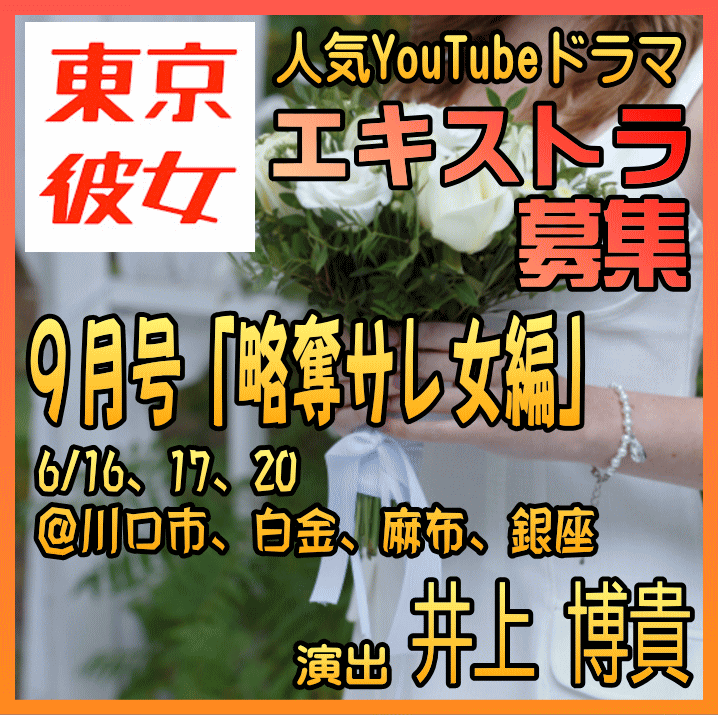 2025-06-10 🔔人気YouTube10分ドラマシリーズ"東京彼女"9月号「略奪サレ女編」エキストラ募集〓📅6/16@川口市、6/17@港区白金、6/20@麻布・銀座〓演出:井上博貴 制作:アニモプロデュース