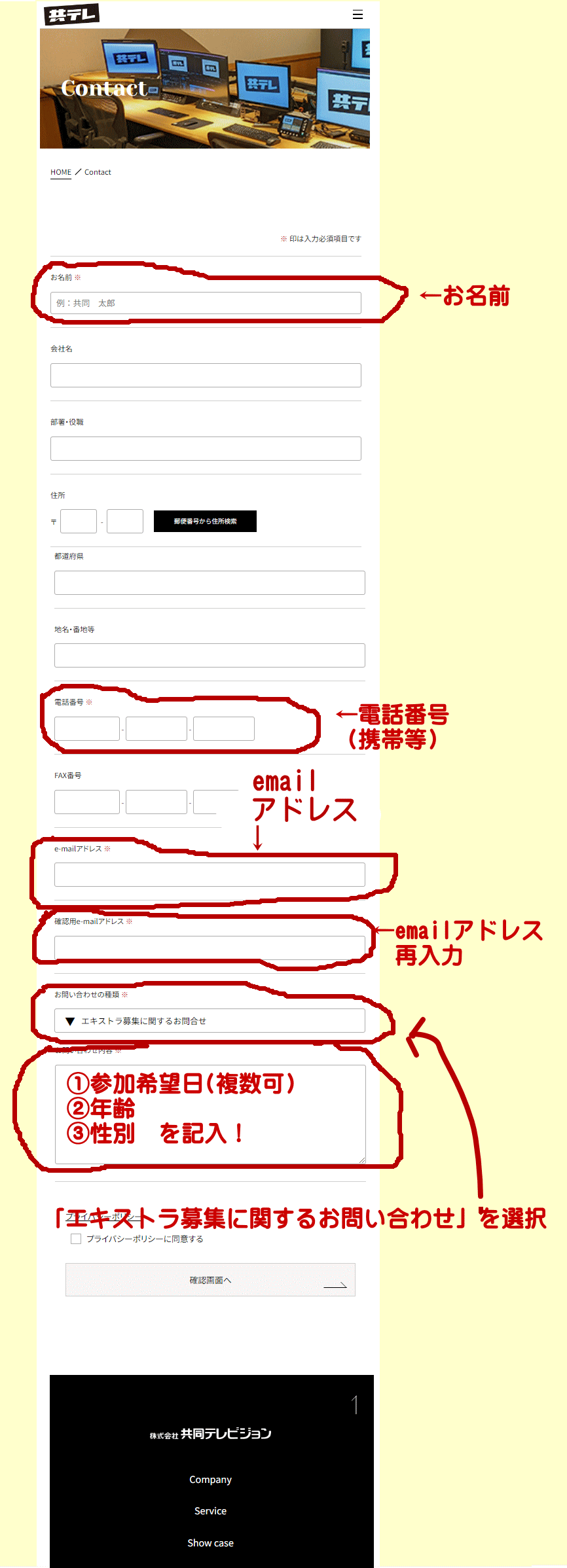 ✔「お問い合わせの種類」で「エキストラ募集に関するお問い合わせ」を選択 し、