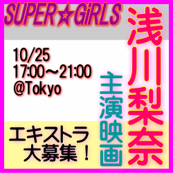 今月25日(水)の夕方~夜9時ごろ新宿か高田馬場あたり。アイドルグループSUPER☆GiRLS所属の浅川梨奈さん[18歳]主演映画の1シーンで、内容は「アイドルグループのライブの場面」……というストレートな募集内容。