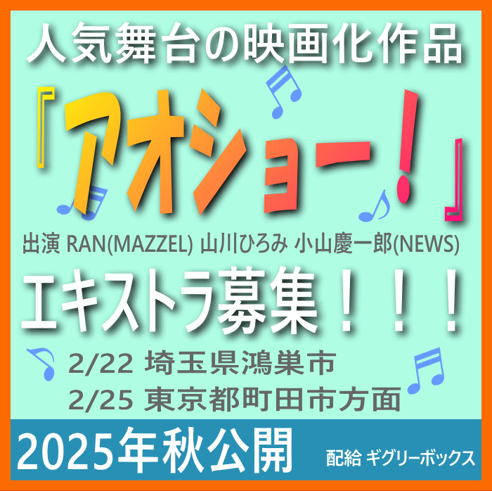 🔔エキストラ募集◆累計10万人を熱狂させた超人気舞台作品を映画化!青春合唱コメディ『アオショー!』〓📅2/22@埼玉(鴻巣市)学生役&観客・家族役📅2/25@東京(町田市方面)親子連れ役2組のみ〓☞W主演:RAN(MAZZEL)、山川ひろみ◆小山慶一郎(NEWS)出演!