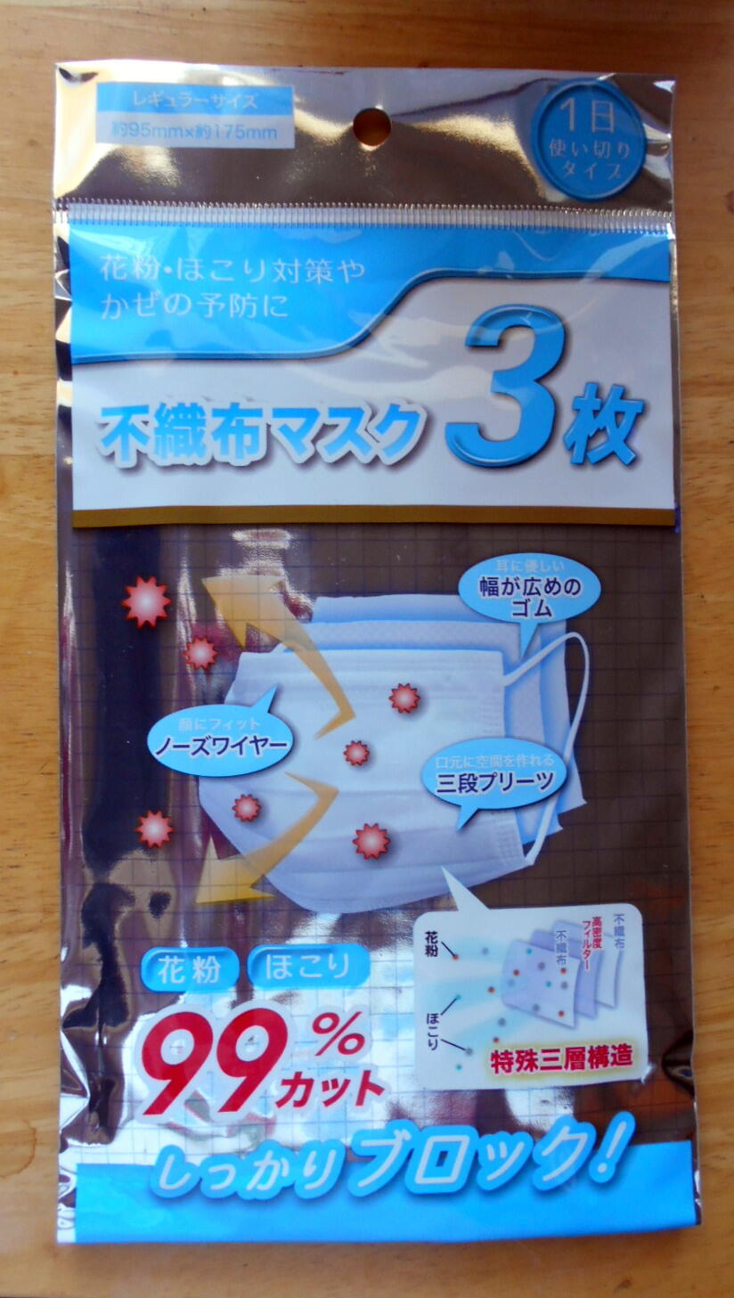 近所の100円ショップに使い捨てマスクが売られているのを見かけ、買い置きはまだあるけど「店頭での再会記念?」に1つ買ってきました。