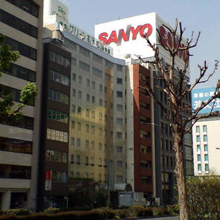現地風景。両サイドに中型ビルがたて込んでいてホテルの外観がいまいち撮りづらい。この構図だと2軒先のビルの屋上の看板ばかりが目立ってしまう......が、ちなみに10年たった2017年時点では「SANYO」の看板は(SANYOブランドが消滅したせいで?)撤去され、だいぶすっきりした街並みになっているようだ。