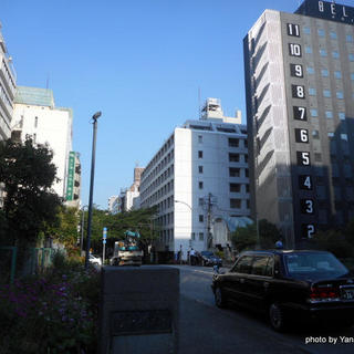- 敷地は旧・楓川(現在は、かつての川底をさらに掘り下げて首都高速都心環状線が走っている)のほとりで、東京駅方面へは高速の上を渡る「新場橋(しんばばし)」を渡る。斜め前に古株の「センターホテル東京」がある。