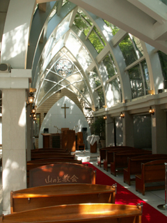 ▲裏手にあるガラス張りのチャペル「山の上教会」。ムード満点。