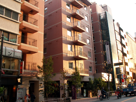 写真右手、1階にエントランスの庇が見えるのが「本館」で、8階建て。エントランスのすぐ上がスリット状になっており、正面から見た感じでは2つの建物に見える。